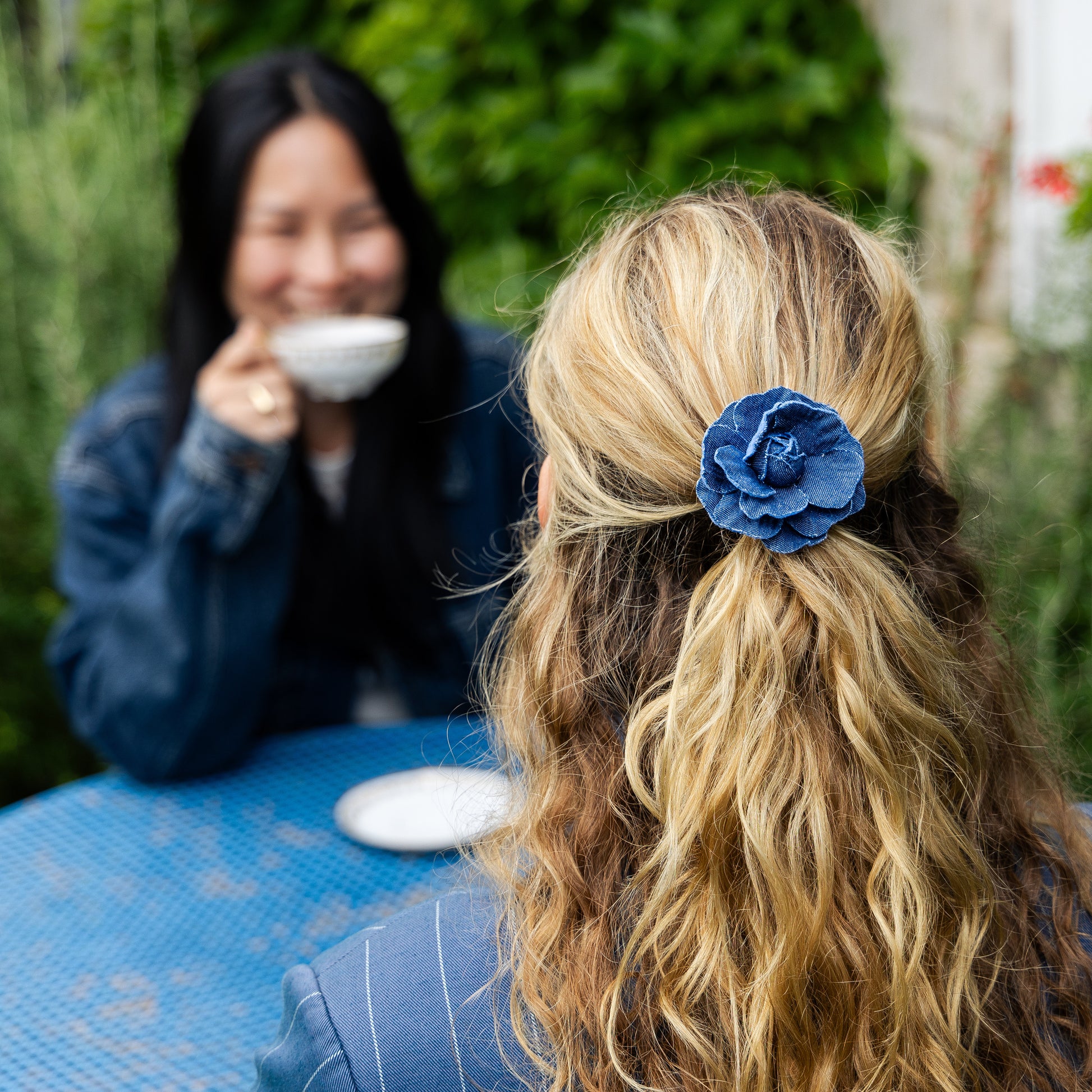 Verleihen Sie Ihrem Look mit diesem Haargummi in dunkler Jeansrosa eine einzigartige Note.