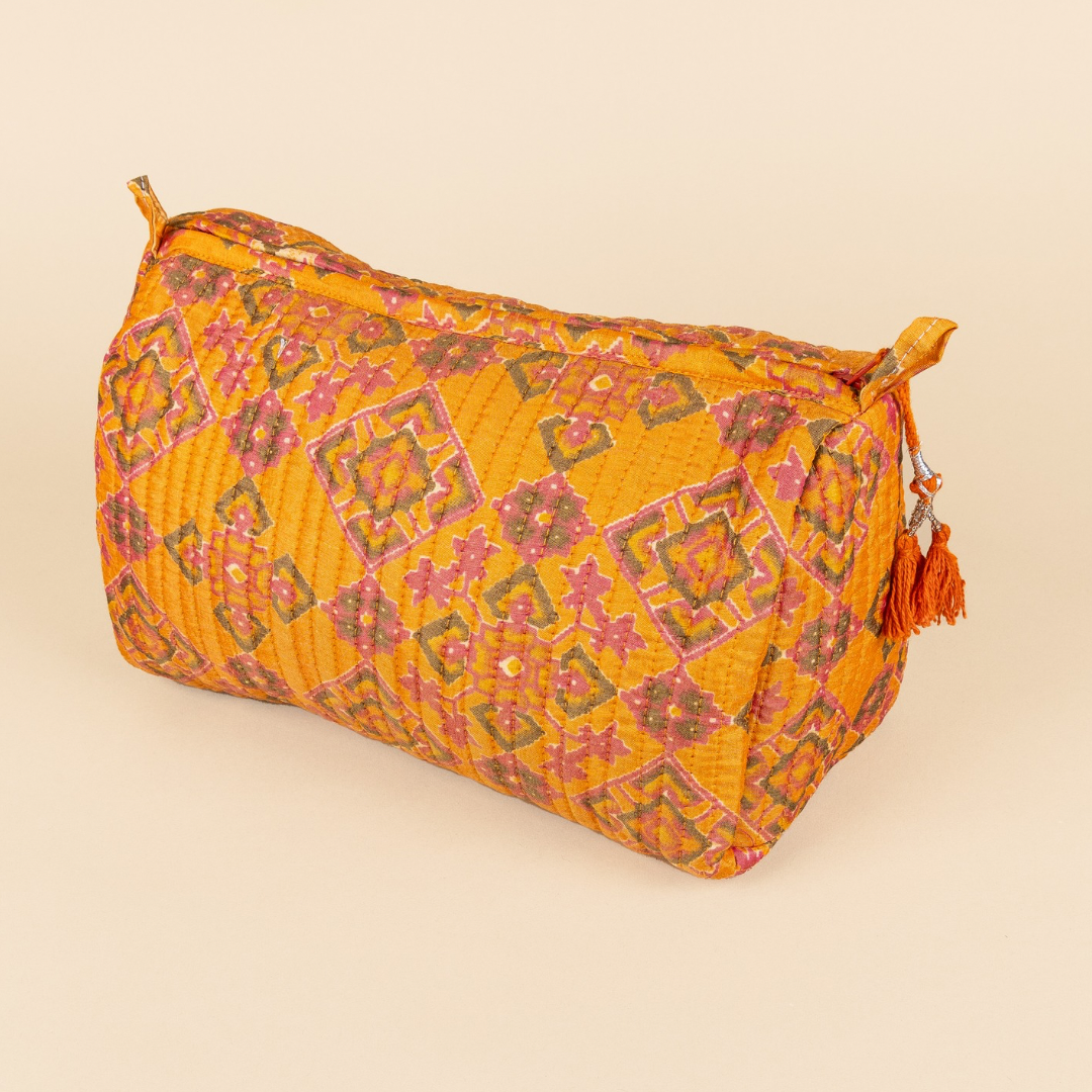 The cheerful prints on our bags and toiletry bags are hand-printed using a centuries-old technique called block printing. Wooden stamps are used to transfer the patterns one by one onto the fabric.