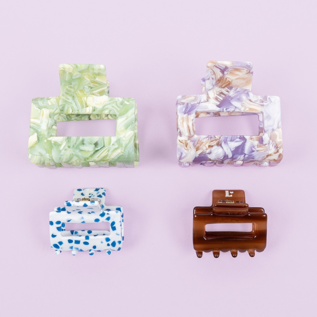 Nos barrettes sont fabriquées en acétate de cellulose, un bioplastique végétal certifié ISCC PLUS. Comparé au plastique issu du pétrole, l'acétate est plus durable et biodégradable. Les composants en acétate et en métal ont été testés et déclarés exempts de substances nocives comme le plomb, le cadmium et les phtalates.
