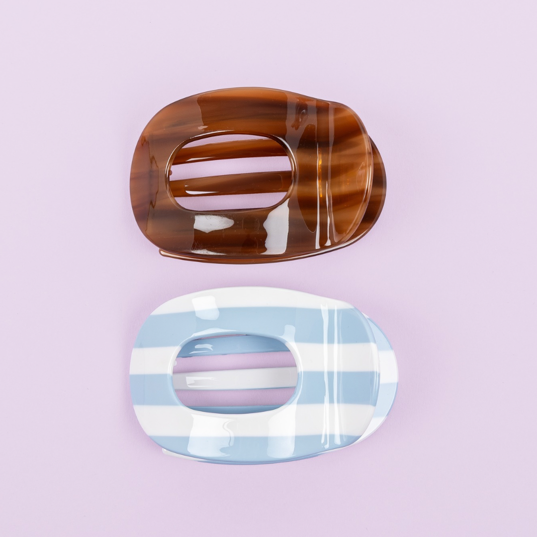 Nos barrettes sont fabriquées en acétate de cellulose, un bioplastique végétal certifié ISCC PLUS. Comparé au plastique issu du pétrole, l'acétate est plus durable et biodégradable. Les composants en acétate et en métal ont été testés et déclarés exempts de substances nocives comme le plomb, le cadmium et les phtalates.
